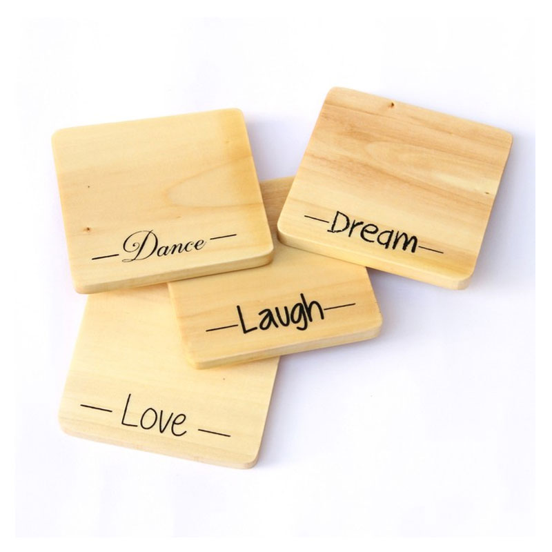 A set of four wooden coasters with inspiring words. Love. Laugh. Dream. Dance. The four golden words to a happy life.